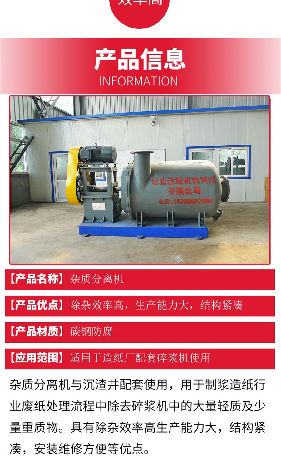 雜質分離機內有特別設計的低摩擦葉片水力型轉子,能使進入的漿料均勻分散,保持篩板不阻塞并防止雜質破碎。輕雜質經粗選機頂部出口排出,進入圓筒篩進行進一步的分離,重雜質經粗選機的底部排出,除雜后的漿料經過后部篩板由出漿管送出。